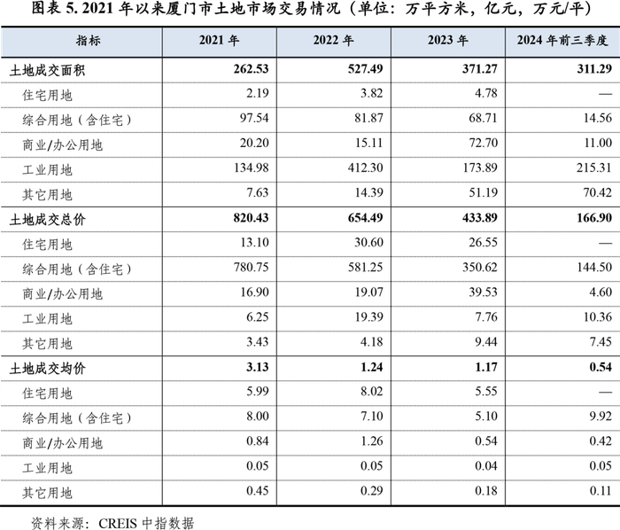 土地市场方面,2023年主要由于综合用地(含住宅)成交量价齐跌,厦门市土地成交总价较大幅下滑,土地市场景气度有所弱化。2023年,厦门市土地成交面积为371.27万平方米,同比下降29.6%,其中,综合用地(含住宅)成交面积为68.71万平方米,同比下降16.1%;土地成交总价为433.89亿元,同比下降33.7%,其中,综合用地(含住宅)成交总价为350.62亿元,同比下降39.7%。2024年前三季度,厦门市土地出让总面积311.29万平方米,实现土地成交总价为166.90亿元,仅约2023年全年规模的三分之一。