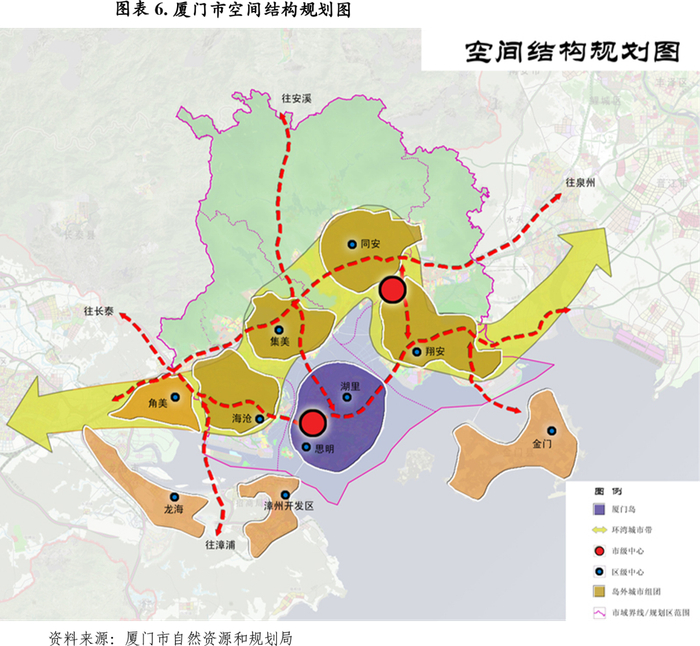 区域发展政策方面,厦门市是中国最早实行对外开放政策的四个经济特区之一、“中国(福建)自由贸易试验区”三片区之一。2015年国务院印发《关于印发中国(福建)自由贸易试验区总体方案的通知》提出自贸试验区的实施范围118.04平方公里,包括厦门片区43.78平方公里,重点建设两岸新兴产业和现代服务业合作示范区、东南国际航运中心、两岸区域性金融服务中心和两岸贸易中心。同年3月国家发改委等部门联合发布的《推动共建丝绸之路经济带和21世纪海上丝绸之路的愿景与行动》,明确提出支持福建建设21世纪海上丝绸之路核心区,对福建省和厦门市的发展意义深远。2022年,国务院出台《国家新型城镇化规划(2021—2035年)》及“十四五”实施方案,将厦漳泉都市圈列为重点培育发展的现代化都市圈之一;2024年6月,为落实《国家新型城镇化规划(2021—2035年)》,贯彻中共中央、国务院《关于支持福建探索海峡两岸融合发展新路建设两岸融合发展示范区的意见》等决策部署,加强顶层设计和统筹协调,凝聚三市合力,深化两岸各领域融合发展,加快厦漳泉都市圈一体化建设,福建省人民政府印发《厦漳泉都市圈发展规划》。