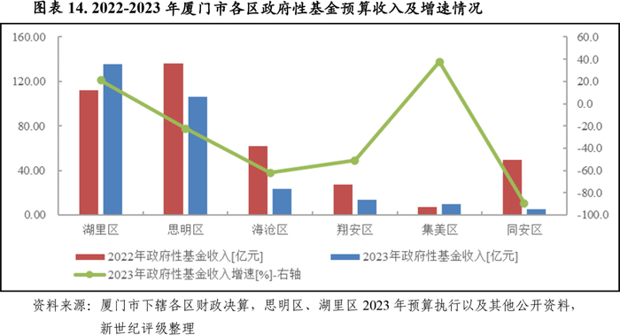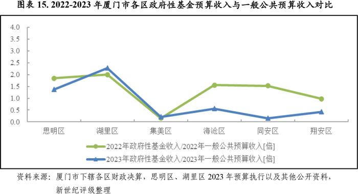 从地方财力稳定性看,2023年同安区、集美区、翔安区、海沧区政府性基金预算收入对财力的贡献度均较低,当年政府性基金预算收入与一般公共预算收入的比分别为0.15倍、0.22倍、0.42倍和0.56倍;思明区、湖里区政府性基金预算收入对财力的贡献度较高,政府性基金预算收入与一般公共预算收入的比分别为1.37倍和2.28倍,财力稳定性相对较弱。