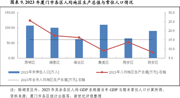 从人均指标来看,2023年厦门市人均地区生产总值15.14万元,思明区、湖里区和海沧区人均地区生产总值高于全市水平,分别为25.61万元、17.27万元和16.24万元;翔安区人均地区生产总值排名第四,2023年为13.71万元,集美区和同安区落后于全市水平,分别为9.06万元和8.06万元。