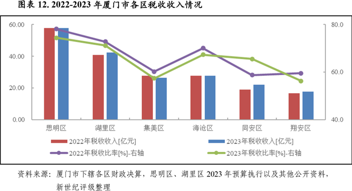 从收入质量构成看,同安区因增值税收入增量较大及专项收入等非税收入有所下降,2023年一般公共预算收入质量有所提高;其余各区受土地增值税较大幅下降及国有资源(资产)有偿使用收入、专项收入等非税收入增加影响,税收比率[4]较上年均有所下降。总体看,思明区和湖里区收入质量仍较好,税收收入占一般公共预算收入的比重分别为74.4%和71.2%;海沧区、同安区次之,税收比率分别为67.3%和65.5%;集美区和翔安区该比率分别为57.4%和56.3%,一般公共预算收入质量仍一般。