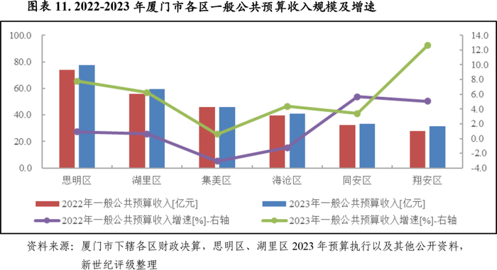 厦门市在财政分配上由市本级统筹较大,下辖各区财政实力普遍有限,岛内思明区和湖里区依托良好的区位优势和较好的产业结构,一般公共预算收入规模稳居各区前二,2023年分别实现77.53亿元、59.40亿元。集美区和海沧区次之,分别为45.87亿元和41.16亿元;同安区和翔安区仍位列后两位,分别为33.50亿元和31.48亿元。从增速看,2023年厦门市各区一般公共预算收入均呈增长态势,但增速差异较大,其中翔安区由于收入基数较小,当期一般公共预算收入增速高达12.6%,集美区受可清算存量房地产项目骤减等因素影响,土地增值税大幅下降,当期一般公共预算收入增速仅为0.6%,其余四区一般公共预算收入增速区间为3.4%-7.8%。