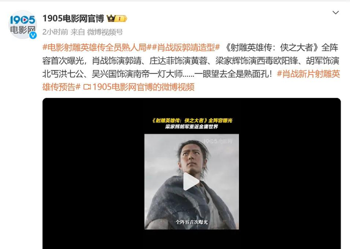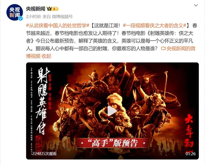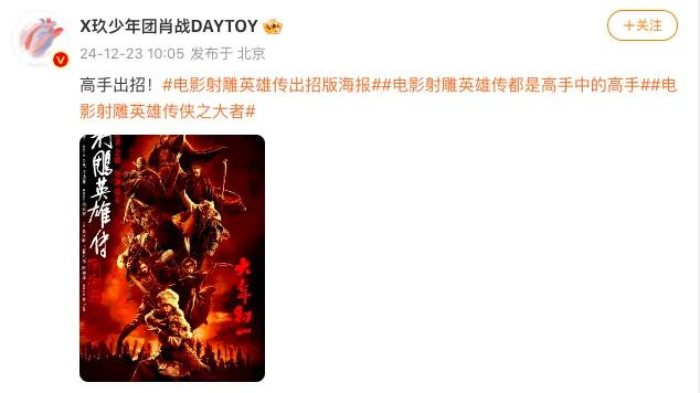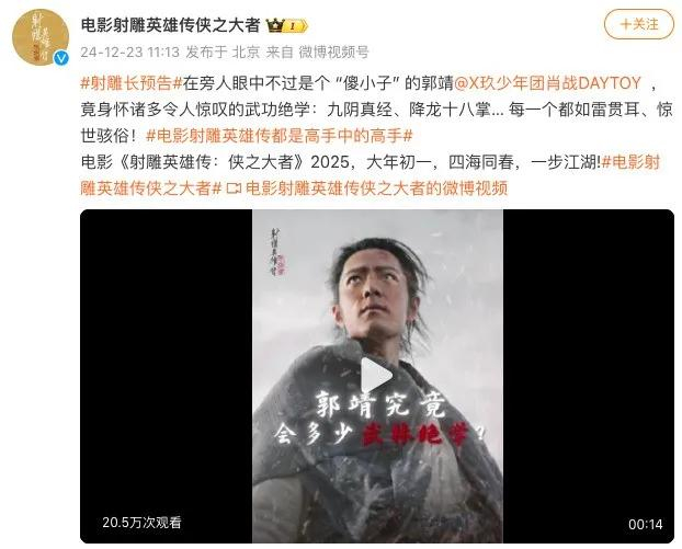 电影《射雕英雄传:侠之大者》官微发文称,“在旁人眼中不过是个 ‘傻小子’的郭靖,竟身怀诸多令人惊叹的武功绝学,九阴真经、降龙十八掌……每一个都如雷贯耳、惊世骇俗!电影《射雕英雄传:侠之大者》2025,大年初一,四海同春,一步江湖!”