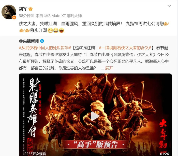 胡军转发称:“九指神丐洪七公请您移步江湖”。