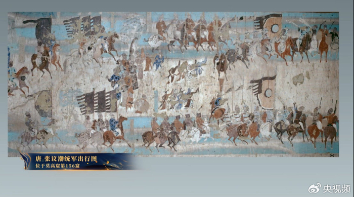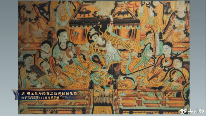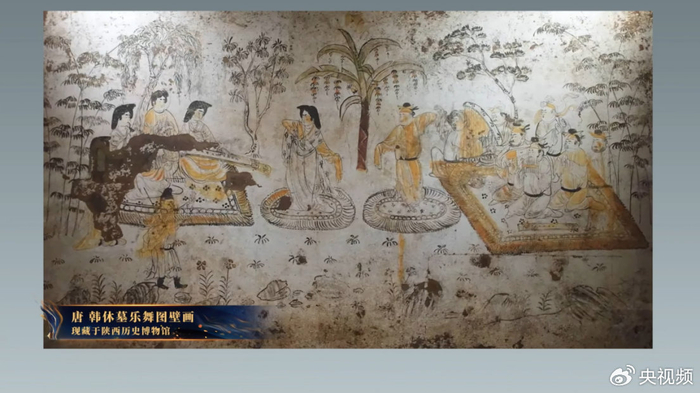 在文物中看到多元并存的大唐盛世。从乐器、服饰到舞蹈,大唐胡汉交融、极具异域风情的乐舞图景徐徐展开。我们看到了位于莫高窟第112窟南壁东侧的观无量寿经变之反弹琵琶乐舞中,画中人物手持琵琶,弹奏起千年前的华美乐章;也看到了现藏于陕西历史博物馆的韩休墓乐舞图壁画中,两位舞者身着唐朝服饰旋转起舞,仿佛看到了西域的胡旋舞跨越历史而来;还看到了在位于莫高窟第156窟的张议潮统军出行图。三件国宝链接古今,以流光溢彩的唐代乐舞、民族交融的艺术美感展示乐舞文化的高光时刻,共同谱写出大唐伟大且辉煌的艺术成就。
