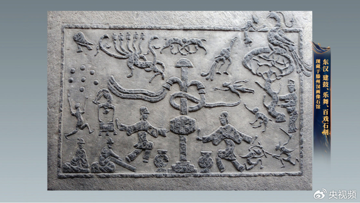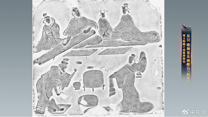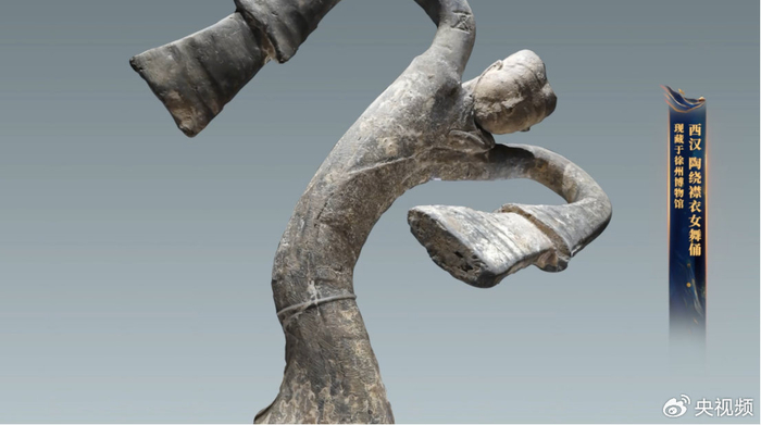 在文物中看到乐舞文化的传承变迁。现藏于徐州博物馆的陶绕襟衣女舞俑,罗衣从风、长袖交横,正是汉代流行一时的长袖折腰楚舞,女舞俑极具舞蹈张力的肢体动作,不仅生动地展现了两千多年前汉代的舞蹈形态,也为当代重访汉舞提供了重要依据。结合现藏于滕州汉画像石馆的东汉“建鼓、乐舞、百戏”石刻中丰富的百戏乐舞场面,以及原文物现藏于成都博物馆的东汉歌舞宴乐画像石(拓片)以舞相属、以乐侑食的宴饮场景,可以看到汉代乐舞文化的统一性和创新性,也能看到汉代乐舞已经逐步从单纯的舞台形式变成一种社交方式。以三件国宝重访汉舞,也是一场对中华文明记忆的追溯。