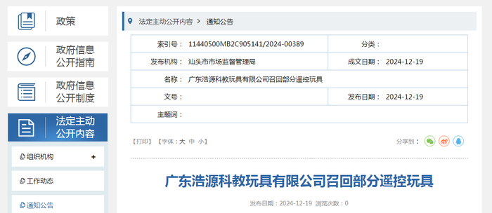 广东浩源科教玩具有限公司召回部分遥控玩具