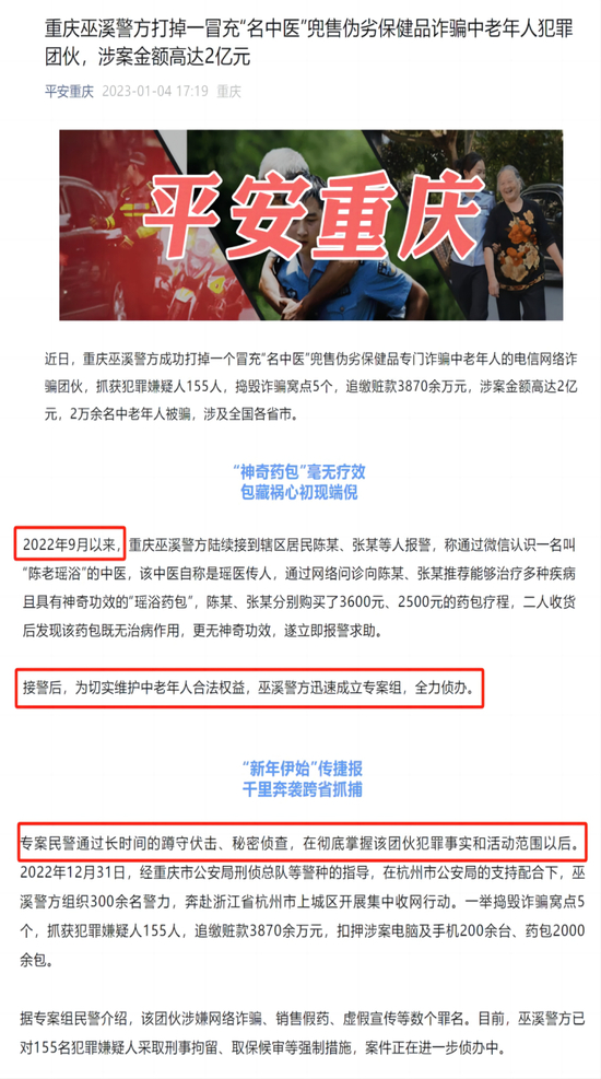 吴先生称,他后来通过代理律师了解到,巫溪县公安局是2022年12月27日接到群众报警,称购买“X浴药包”被骗了1682元。巫溪县公安局接到报案的当天便以“诈骗案”立案,4天后便组织几百名警力跨省来到杭州市,将他儿子及公司100多名员工拘传到1200多公里外的重庆,并且暂扣、查封了公司账面上数千万元资金。他认为,巫溪县警方存在趋利执法的嫌疑,因为通过媒体对该案的公开报道,可以证实巫溪县警方是先侦查后立案。他表示:“我认为这种行为就是不久前《人民日报》在评论文章《‘远洋捕捞’式违规执法的黑手必须斩断》中提到的‘远洋捕捞’”。