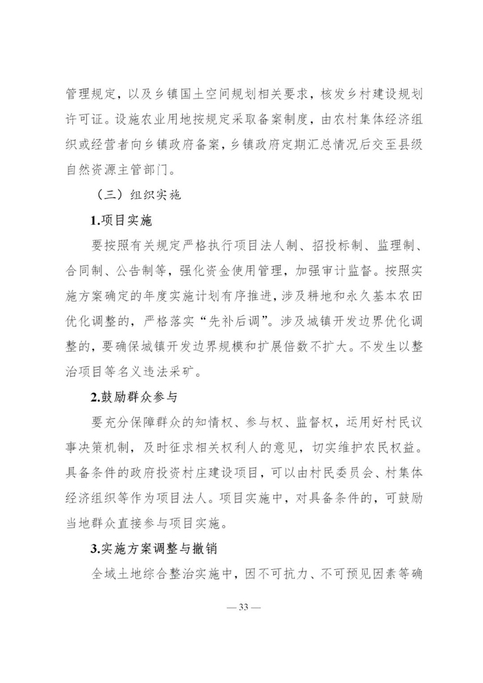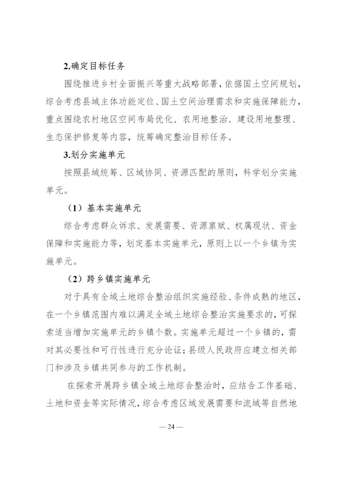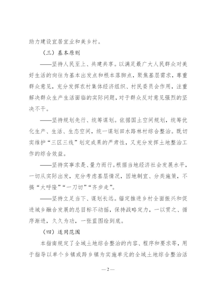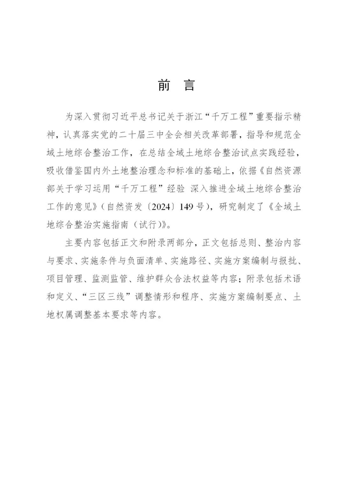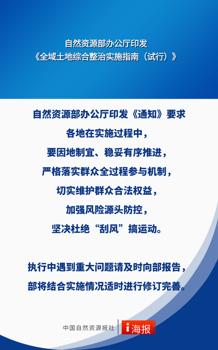 为指导各地稳妥有序推进全域土地综合整治工作,依据《自然资源部关于学习运用“千万工程”经验 深入推进全域土地综合整治工作的意见》(自然资发〔2024〕149号)等文件要求,研究制定了《全域土地综合整治实施指南(试行)》。经部领导同意,现予以印发,请结合实际贯彻落实。各地在实施过程中要因地制宜、稳妥有序推进,严格落实群众全过程参与机制,切实维护群众合法权益,加强风险源头防控,坚决杜绝“刮风”搞运动。执行中遇到重大问题请及时向部报告,部将结合实施情况适时进行修订完善。