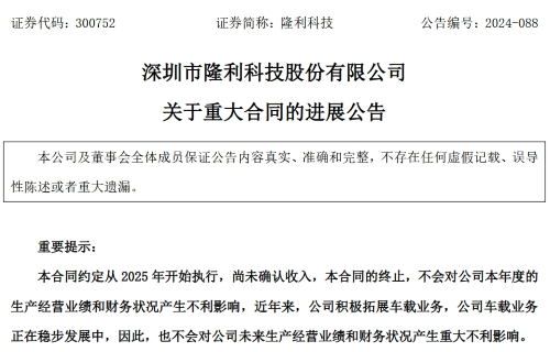 12月20日,隆利科技发布重大合同进展公告,其表示,近日,公司与德国博世就此前签署的为BMW(宝马汽车)项目提供2025-2033年所需的车载Mini LED背光显示模组产品的项目进行了进一步的沟通,决定终止该《长期合同》。