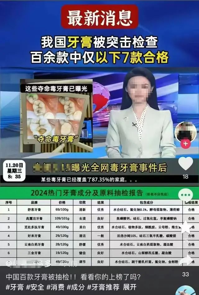 “百余款牙膏被抽检,仅以下7款成分合格”