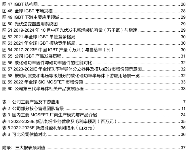 国内领先的功率半导体厂商,中低压MOSFET和高压IGBT产品齐头并进。公司共有四大产品平台,按照2024上半年营收占比大小依次为SGT MOS、Trench MOS、IGBT和SJ MOS。(1)MOSFET是全球功率半导体市场中占比最高的细分赛道,而中国拥有全球最大的MOSFET市场,2024年占比42.61%,市场规模60.3亿美元,2026年有望达到69.5亿美元,其中在中低压应用场景中,沟槽型MOS为主流选择,中高端应用中SGT MOS更有优势。SJ MOS主要适用于高压场景。尽管MOSFET市场主要由英飞凌、安森美等海外龙头主导,但近年来国内MOSFET厂商不断加速相关产品的国产替代,2024年沟槽型和超结型MOS的国产化率分别有望达到49.70%和34.60%。公司MOSFET产品涵盖主流工艺,电压覆盖12~900V,料号齐全,2023年公司MOSFET营收占国内MOSFET市场规模的2.97%。(2)IGBT主要应用于高压低频场景,如光伏逆变器,IGBT在光伏逆变器中价值量占比15-20%。2024年全球IGBT市场规模为75亿美元,2026年有望达84亿美元,年增长率在5%左右。IGBT单管与模块市场基本由英飞凌、富士电机等占据,但国内厂商已完成“0-1”的技术突破,正处于国产替代的增长阶段,2023年自给率上升至32.9%。公司2024年上半年IGBT营收占比达16.2%,2023年公司IGBT营收占全球IGBT市场规模不足1%。覆盖电压高达1700V,公司在光储领域国内单管龙头地位稳固,并在逐步发力模块产品,积极推广第七代IGBT产品,在8寸和12寸晶圆全部具备量产条件。(3)公司布局第三代半导体相关功率产品,目前SiC MOSFET系列产品部分已开发完成并进入小规模销售阶段,GaN HEMT已有部分型号通过可靠性考核,极大丰富了产品布局。
