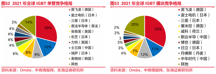 (4)全球IGBT市场集中度较高,全球龙头企业以英飞凌、富士电机、三菱等为代表,占据了超过50%的市场份额。根据Omdia,2021年全球IGBT单管市场中,前十大厂商中只有士兰微是中国大陆企业,市场份额4%;2021年全球IGBT模块市场中,中国大陆企业斯达半导和中车时代分别占据前十的一席之地。英飞凌无论在单管还是模块都处于绝对领先地位,而国内厂商由于起步时间较晚,市场份额相对低,且只在某一产品上具备竞争优势。