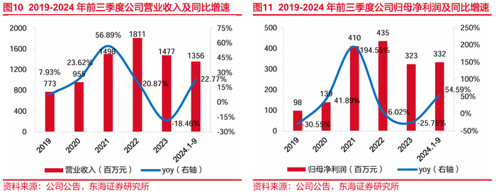 (1)2024年前三季度公司营收与归母净利润同比显著回升。2019-2022年,公司规模不断扩张,业绩稳步向好。2023年,受全球经济增速放缓、下游应用市场景气度波动、局部国际形势恶化等影响,叠加国际大厂与国内企业开启价格竞争因素,公司业绩短期承压,营收与归母净利润同比分别下滑18.46%和25.75%。2024年前三季度,下游市场景气度向好,新兴应用领域需求显著增加,部分产品出现了供不应求甚至持续加单的情况,公司及时了解并积极响应下游客户需求变化,提前加大排产,满足市场新增需求,进而推动业绩稳步增长,2024年1-9月公司营收同比增长22.77%,归母净利润同比增长54.59%。