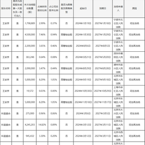 王安京还存在股份被冻结情况。科蓝软件同日公告称,于近日收到控股股东王安京先生及其一致行动人宁波科蓝盛合投资管理合伙企业(有限合伙)(以下简称:科蓝盛合)通知,并通过中国证券登记结算有限责任公司深圳分公司系统查询,获悉王安京先生及其一致行动人科蓝盛合所持有的部分公司股份存在被司法冻结及司法再冻结的情况,合计司法冻结股份占公司总股本的比例达到5.82%。