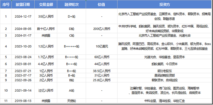 成立于2019年的智谱自去年以来就是资本宠儿,天眼查统计的11次融资,有8次都发生在2023年以后,且同时获得腾、阿里、美团、小米、蚂蚁等大厂加持。