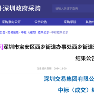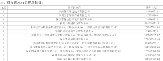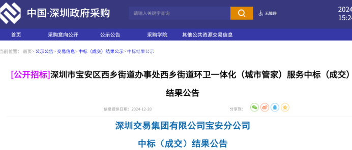 环卫在线网讯,2024年12月20日,广东省深圳市宝安区西乡街道办事处发布西乡街道环卫一体化(城市管家)服务中标结果公告,玉禾田携手酷哇科技、盈峰环境携手文远知行、玉意环保、福龙马、宇润携手赛特等共13家企业(联合体)参与投标,最终3家企业(联合体)入选候选中标供应商,其中,深圳玉禾田智慧城市运营集团有限公司联合酷哇科技有限公司拿下项目,报价1.83亿元/年,服务年限3年,项目费用合计约5.5亿元。