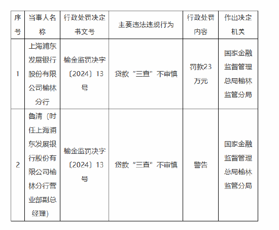 浦发银行榆林分行被罚23万元:因贷款“三查”不审慎