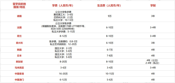 其中,德国、法国、意大利的公立大学免学费,只需缴纳注册费,各国院校有所差异,比如法国本科注册费170欧元到2770欧元不等,约合人民币1300元到22000元,而私立大学学费则在5万到20万元不等。