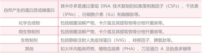 免疫系统具有免疫防御、免疫自稳、免疫监视的作用,是机体执行免疫应答等免疫功能的重要系统。其中,免疫调节剂种类繁多(表2),并通过调节免疫细胞的活性、影响信号传导或改变免疫反应的平衡,在免疫系统的不同环节发挥调控作用。共识中,专家组从免疫调节剂影响免疫细胞发育、天然免疫或获得性免疫的视角总结了目前已报道的抗感染、促进免疫平衡的调控机制。