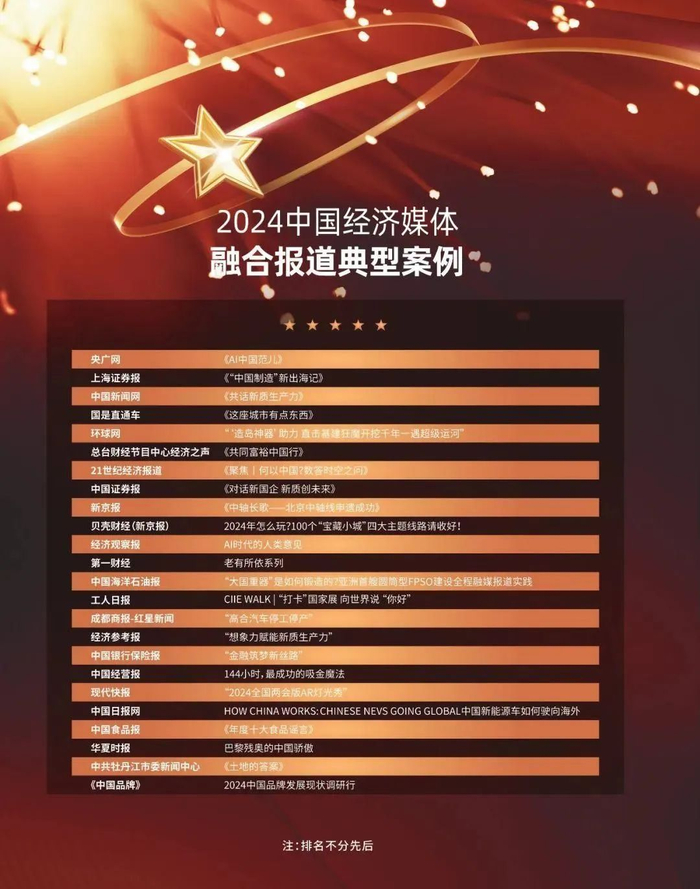 24个获评“2024中国经济媒体融合报道典型案例”的新闻作品,综合运用多媒体手段报道,主题鲜明、内涵丰富、形式新颖,让正能量与大流量同频共振。