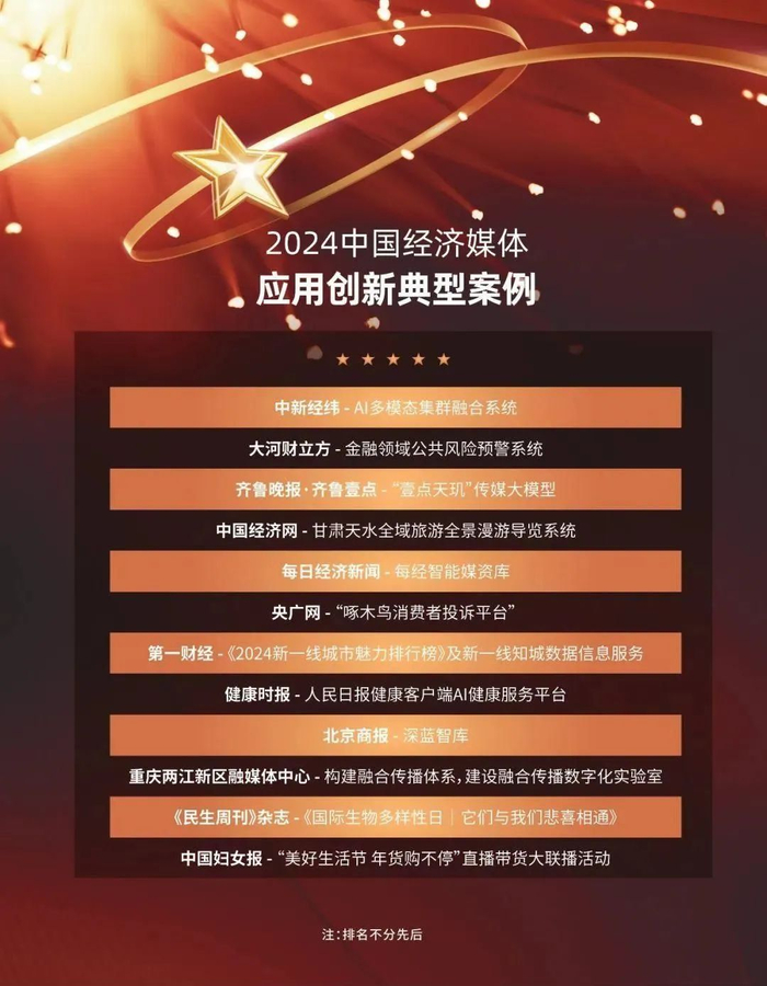 获评“2024中国经济媒体应用创新典型案例”的新闻单位分别是:中新经纬、大河财立方、齐鲁晚报·齐鲁壹点、中国经济网、每日经济新闻、央广网、第一财经、健康时报、北京商报、重庆两江新区融媒体中心、《民生周刊》杂志、中国妇女报。