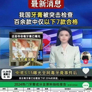 记者上网搜索发现,类似消息不少。这些消息大都模仿电视台主持人播报新闻的形式发出,前面陈述的内容基本都差不多,只是被列出的合格牙膏品牌各不相同。有的列出7款,有的列出6款,但具体的抽检机构名称、抽检时间则完全没有显示。