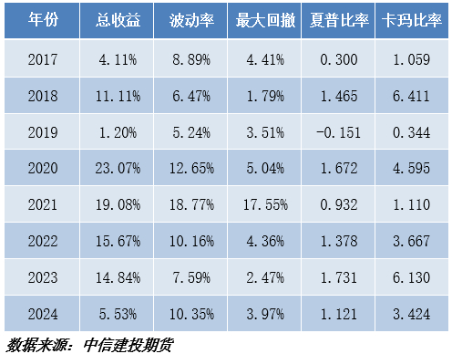 从策略稳定性来看,策略净值在2022年之前走势相对平稳,净值稳步上升,未出现较大回撤。2022年之后随着地缘因素出现,策略波动幅度加大,特别是在2022年初,策略出现较大回撤,其次,策略创造新高时间较短,较长时间都处于震荡调整期,最大回撤周期接近1年,整体来看策略在2020至2023年盈利能力较强,但是波动幅度也相应加大,其他年份盈利能力较差,在2017,2019与今年,策略收益都低于5%,盈利能力较差。