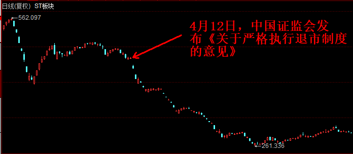 在中国证监会4月12日发布《关于严格执行退市制度的意见》的次个交易日,同花顺ST板块便大跌5.35%,而ST板块指数在随后的两个多月,整体呈现下跌趋势,从4月12日的467.89点,一度下跌至6月26日的261.34点,ST板块指数在两个多月的时间跌幅高达44.14%。