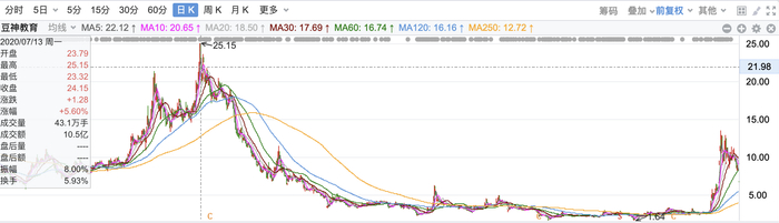 但12月开始,公司股价相对此前高位出现回调。12月30日,豆神教育有5.86亿天量股解禁,占总股本28.34%,占流通股本51.95%。