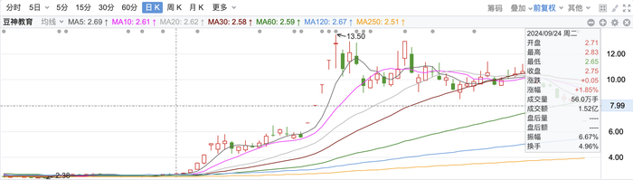 10月28日开始,豆神教育连续4个交易日20CM涨停。而9月24日以来,豆神教育股价从2.75元/股,最高涨至11月1日的13.50元/股,期间涨幅接近400%。