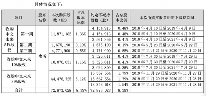 彼时收购,窦昕承诺中文未来2019年度至2021年度实现净利润(以扣除非经常性损益前后的净利润孰低值为准)分别不低于1.3亿、1.69亿和2.1亿元。同时,窦昕承诺自交割日起8年内在中文未来持续任职,并且窦昕还要按照股权转让协议相关约定认购立思辰的股票。