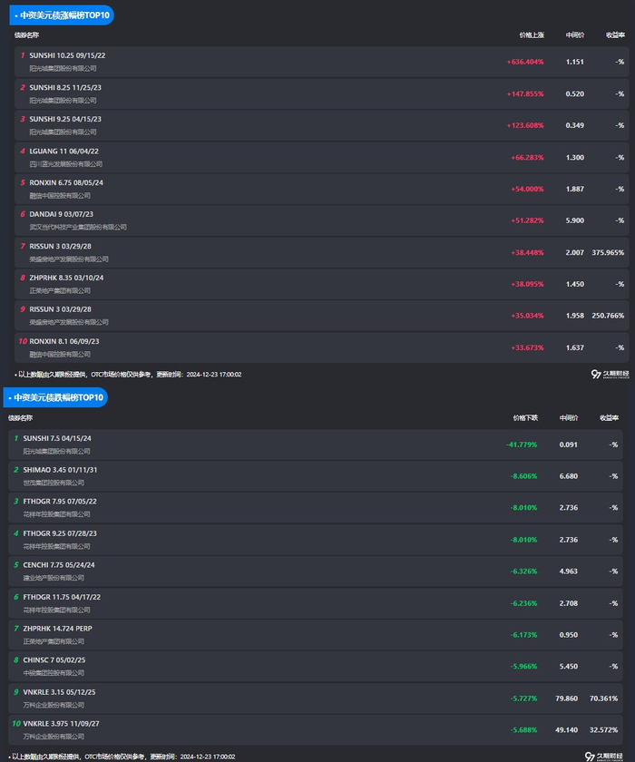 12月23日,中资美元债涨跌幅榜TOP10如下: