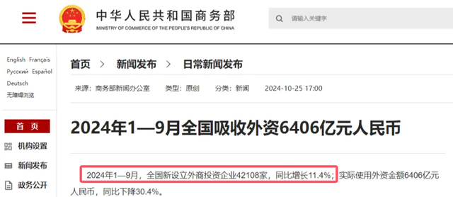 这几年,外媒不断炒作外资撤离中国的言论,我国也是多次辟谣。商务部发布的数据显示,2024年1到9月,全国新设立外商投资企业42108家,同比增长11.4%,外资仍然在大量涌入。