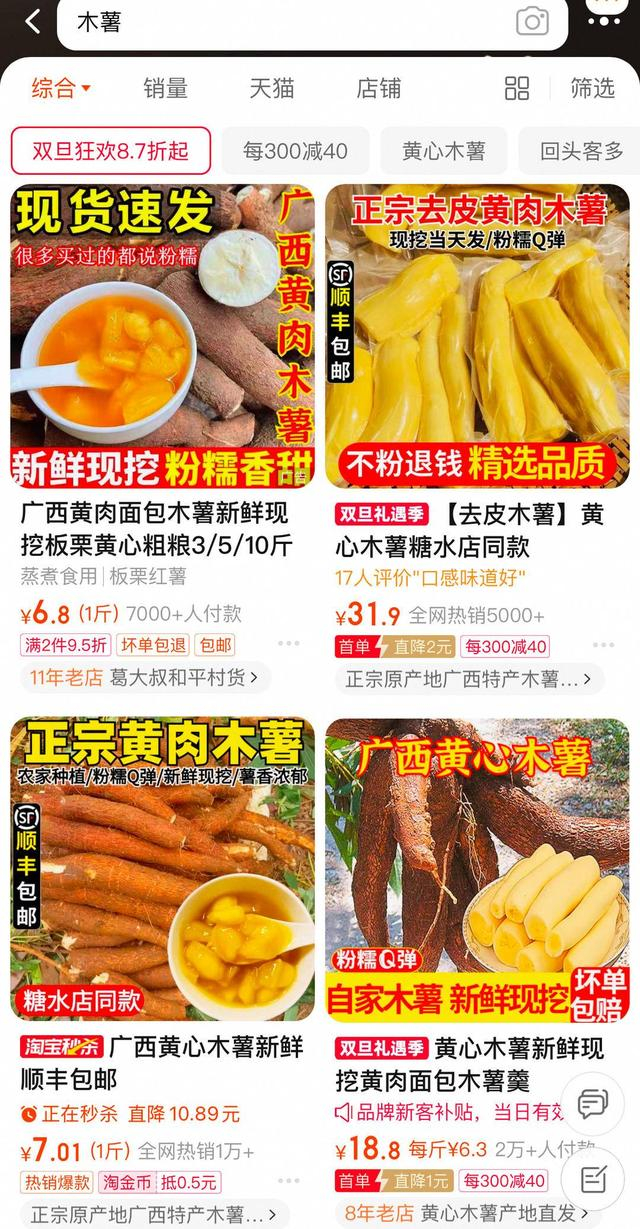 在网购平台搜索“木薯”,也可以看到售卖的店铺很多,绝大多数来自广西,同样销量很好。