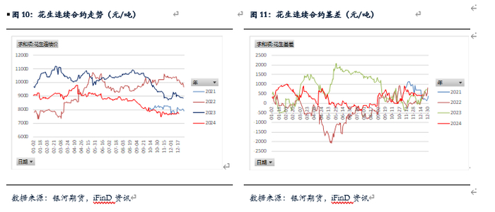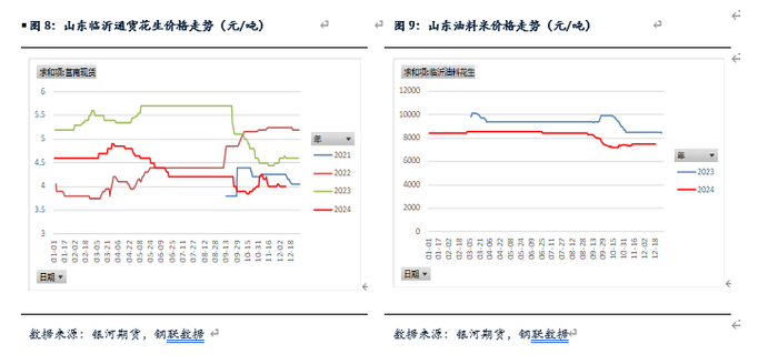 2024年花生现货波动相对平稳,河南主产区花生基本在4.0元/斤-5.0元/斤。以河南驻马店正阳花生为例,最低点出现在9月底的3.85元/斤,最高点出现在3月底的5.05元/斤。1月到3月底,油厂入场收购,花生价格上涨。4月到9月底,花生种植面积增加,花生消费较弱,花生现货下跌。10月到12月底,花生现货大量上市,油厂入场收购,花生现货底部震荡,目前基本在4.1元/斤窄幅波动。