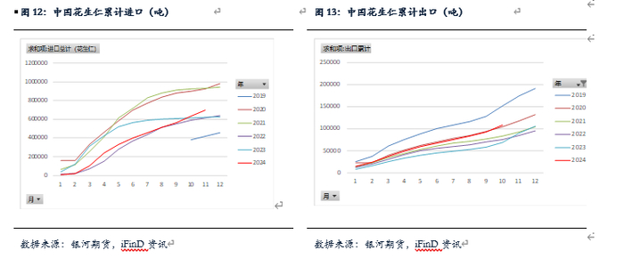 2024年1-11月花生油累计进口23.3万吨,高于去年2%。出口量极少,基本个位数,可以忽略。近几年花生油进口基本维持在20-30万吨。