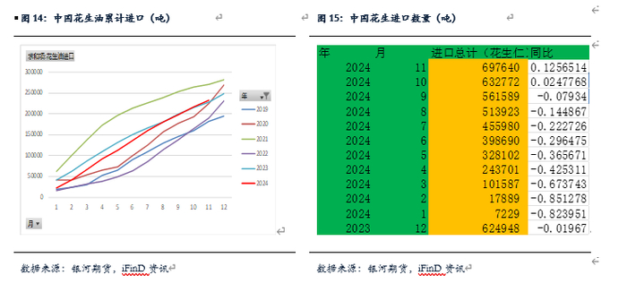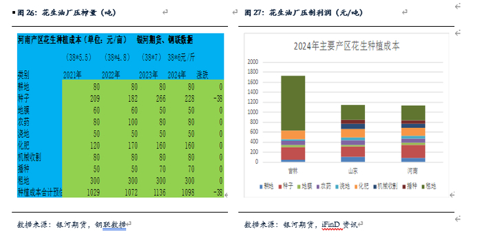 钢联数据面积2023年低于统计局350千公顷,面积少约8%。钢联2023年产量低于统计局270万吨,产量少14%。根据市场调研,我们认为钢联数据相对接近市场。2024年花生产量基本和2023年持平,大约产量1650万吨。2024年花生面积增加,主要原因是2023年花生种植收益较好,且河南2024年玉米价格大幅下跌,种植玉米收益大幅下滑,花生收益高于玉米收益。钢联数据显示2024年花生种植面积4795千公顷,高于2023年大约8%。但是花生产量基本和2023年持平,主要原因是5月到6月河南及山东西部地区种植期间降雨较少及干旱,尤其是河南南阳及驻马店等地,花生产量减产导致。