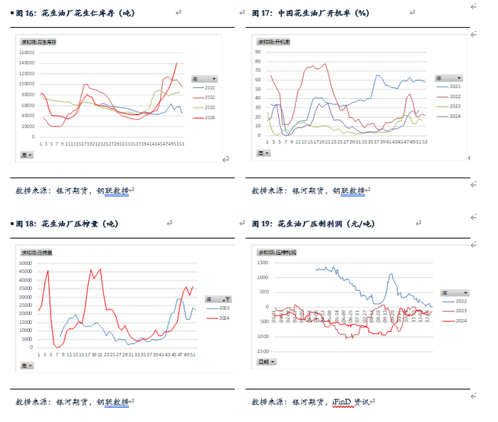 2024年花生油厂利润波动低于去年,8月底压榨利润达到年内新低-727元/吨,这和去年8月底利润最高正好相反。随着10月新花生上市,花生价格底部震荡,油厂利润基本维持在盈亏线附近。但花生油厂花生库存高于去年,开机率也高于去年。主要原因是去年8月后,整个农产品都持续下跌,花生价格也从最高点持续下跌,但2024年新季花生跌到4.0元/斤的低位,花生油厂收购增多,开机率也大幅增加。截止12月20日,国内花生油样本企业厂家花生仁库存14.0万吨,高于去年的8.4万吨。花生油年底开机率27.5%,高于去年同期的17.9%。截止12月20日,花生油厂榨利为-62元/吨,高于去年同期-360元/吨。由于花生库存仍较高,且花生价差会长时间维持低位,预计花生油厂在2025年上半年花生库存仍会维持高位,花生油利润也会长时间在盈亏线附近。