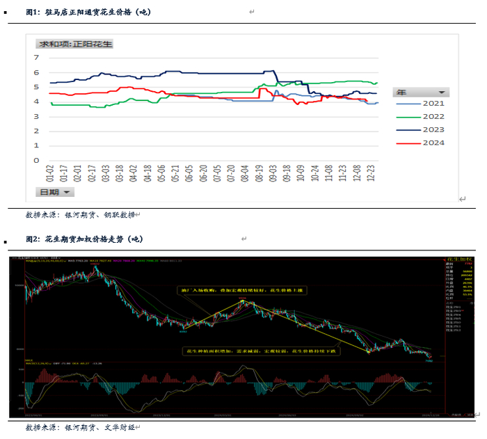 期货走势分析:1-3月上涨阶段,节后宏观情绪转好,油厂入市收购,花生价格持续上涨到年内高点。4月-9月底下跌阶段,由于去年花生种植利润较好,玉米价格持续下跌,花生种植面积增加,叠加宏观较弱,整个大宗商品都在下跌,花生期货跌倒新低。10月-12月震荡偏弱阶段,花生大量上市,同时油厂入场收购,现货花生底部震荡,期货盘面震荡偏弱,期货弱于现货。
