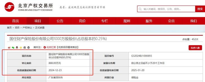 据北京产权交易所今日披露,国任保险的1000万股股份(占总股本的0.25%)自12月23日起被公开挂牌转让,转让方北京汽车集团产业投资有限公司(以下简称“北汽产业投资”),为北京市属国企北汽集团是全资子公司。上述股权此次挂牌转让底价为888万元。