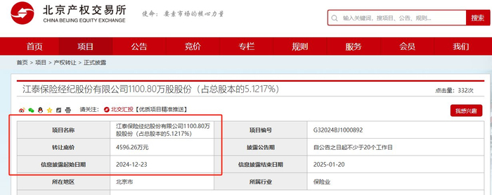 与此同时,江泰保险经纪1100.80万股股份(占总股本的5.1217%)今日也同样在北京产权交易所开始公开挂牌转让,转让方三峡资产管理有限公司(以下简称“三峡资产”),为央企三峡集团的全资子公司。上述股权此次挂牌转让底价为4596.26万元。