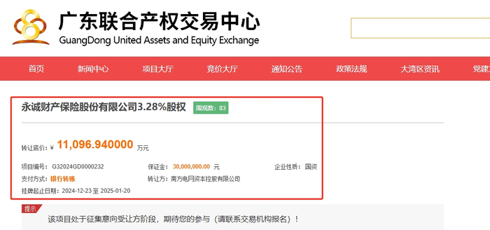此外,据广东联合产权交易所披露,永诚保险3.28%股权今日起被公开挂牌转让,转让方南方电网资本控股有限公司(以下简称“南网资本控股公司”),为央企中国南方电网的全资子公司。上述股权此次挂牌转让底价为11,096.94万元。