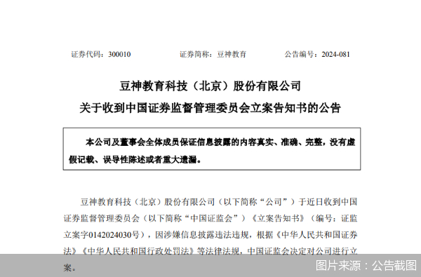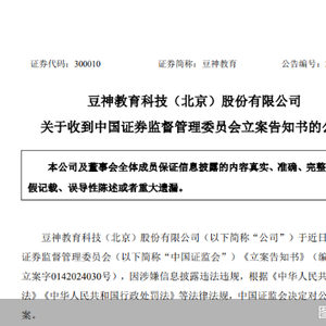 据豆神教育发布的公告,其于近日收到证监会《立案告知书》,因涉嫌信息披露违法违规,证监会决定对公司进行立案。