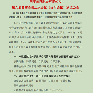 具体而言,今日东方证券新聘任的高管团队涉及副董事长、5名副总裁以及财务总监、首席风险官兼合规总监、董事会秘书,分别为:选举鲁伟铭担任公司第六届董事会副董事长;聘任卢大印为公司副总裁(主持工作);聘任舒宏、张建辉、陈刚、吴泽智为公司副总裁;聘任舒宏兼任公司财务总监;聘任蒋鹤磊为公司首席风险官兼合规总监;聘任王如富为公司董事会秘书。