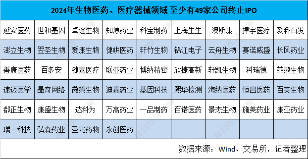 据记者不完全统计,作为IPO公司重要来源的生物医药、医疗器械领域,在2024年至少有49家公司终止了IPO,这一数据占据了整体终止IPO企业数的11.40%,包括延安医药、世和基因、卓谊生物等。
