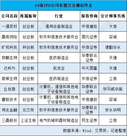 上述过会后撤回IPO申请的企业中,又有10家是在提交注册后终止的,包括一通密封、晶奇网络、旷视科技、菲鹏生物、达科为、微策生物、丘钛微、睿联技术、用友金融和三晶股份。