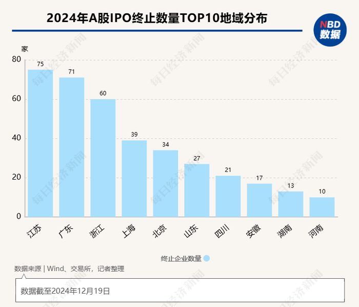 从终止IPO企业的地区分布来看,江苏、广东、浙江、上海、北京、山东、四川、安徽、湖南、河南排名靠前,分别有75家、71家、60家、39家、34家、27家、21家、17家、13家和10家。