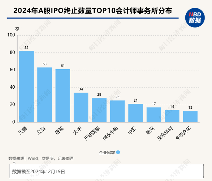 从终止IPO企业的会计师事务所分布来看,天健会计师事务所(特殊普通合伙)、立信会计师事务所(特殊普通合伙)、容诚会计师事务所(特殊普通合伙)、大华会计师事务所(特殊普通合伙)、天职国际会计师事务所(特殊普通合伙)、信永中和会计师事务所(特殊普通合伙)和中汇会计师事务所(特殊普通合伙)服务的企业数较多,分别为82家、63家、61家、34家、28家、25家和21家。