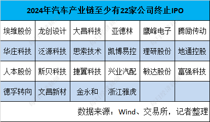 与此同时,至少有22家汽车产业链公司在2024年终止IPO,这些公司包括埃维股份、龙创设计、浙江雅虎等。